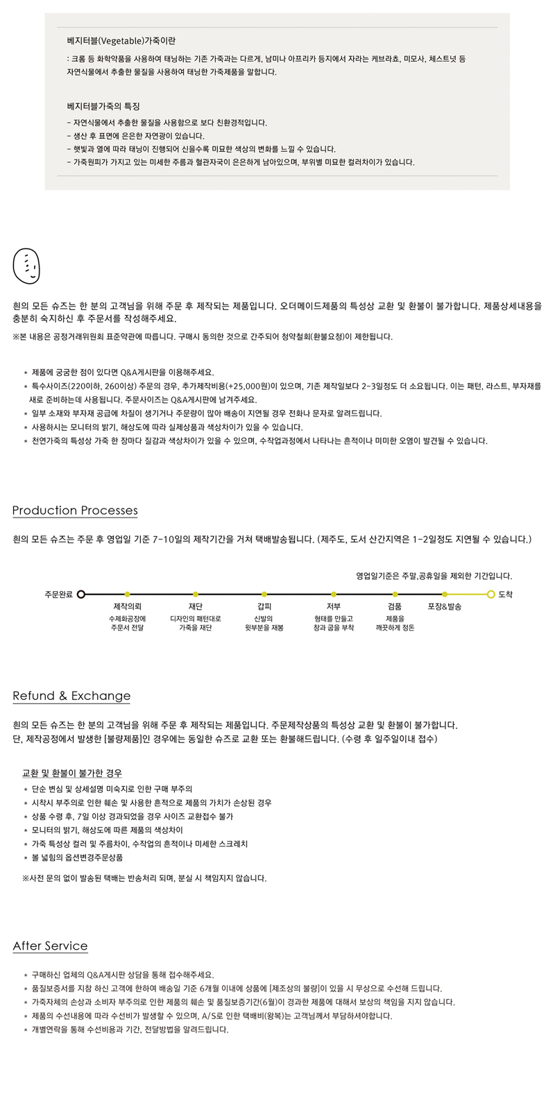 - 주문시 유의사항 : -흰의 모든 슈즈는 한 분을 위해 주문 후 제작하는 오더메이드슈즈입니다. -결제가 완료되면 익일 오전부터 수제화공장을 통해 제작하게되며, 약 일주일의 제작기간을 거쳐 택배를 통해 받으실 수 있습니다. -주문제작상품의 특성상 제품불량이 아닌 단순변심에 의한 교환 및 환불이 어렵습니다. 컬러와 사이즈를 신중하게 결정하신 후 주문해주세요. - 본 상품은 넉넉한 피팅감의 슈즈입니다. 한 사이즈 작게 주문하시길 권장합니다. - 평소 두 사이즈를 오가신다면 작은사이즈로 주문해주세요.