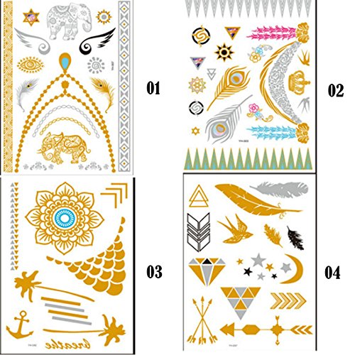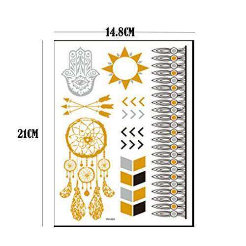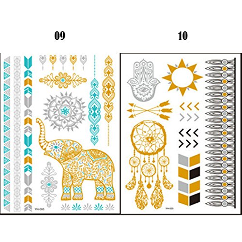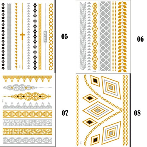 -. Feature : Size: 14.8*21cm, Package: 10 sheets / Metallic temporary fake jewelry tattoos, used to decorate as bracelets, feathers, wrist and arm bands / Mix designs Suitable for DIY on any surface you like: body, handmade crafts, cellphones, books, laptops, glasses, and other surfaces / Good gift for your loved ones or friends, perfect for daily use and party, nightclub / Sexy, personality, cool, safe and useful. We try on all the products before sell.100% money back guaranteed
