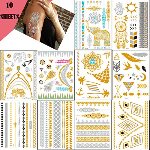 -. Title : Lookathot 10 Sheets Temporary Tattoo Stickers DIY- Metallic Tattoos Paper Gold Silver Black Turquoise Removable Waterproof Sweat Resistant Long Lasting Fake Jewelry Body Decals