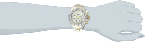 Two-tone gold and silver base metal cas eand bracelet. Fixed silver-tone bezel set with crystals. White mother of pearl dial with gold-tone hands and Arabic numeral hour markers. Dial Type: Analog. Luminescent hands. Date display between 4 and 5 o'clock positions. Quartz movement. Scratch resistant mineral crystal. Pull / push crown. Screw-down case back. Case diameter: 40 mm. Case thickness: 10 mm. Round case shape. Band width: 22 mm. Band length: 8.5 inches. Deployment with push button clasp. Water resistant at 10 meters (33 feet). Functions: chronograph, date, hour, minute, second. Dress watch style. August Steiner Two-tone Ladies Watch AS8031TTG.Feature