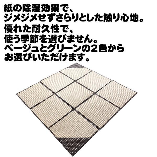 紙の除湿効果でサラッとした触り心地のラグマット! 落ち着いたカラーで インテリアの邪魔をせずお部屋に馴染みやすいデザイン 軽量で女性でも楽に持ち運べるので 洗濯時や模様替え、シーズンオフの収納も簡単! お部屋で寛ぐには必須のアイテムです。 色はベージュとグリーンの2色からお選びいただけます。 <仕様> 【サイズ】180×180cm 【素材】 表:紙     ヘリ:ポリプロピレン 中身:ウレタンフォーム 裏:不織布