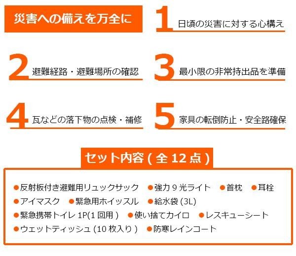 | セット内容 | 反射板付き避難用リュックサック、強力9光ライト、首枕、耳栓、アイマスク、緊急用ホイッスル、給水袋(3L)、緊急携帯トイレ1P(1回用)、使い捨てカイロ、レスキューシート、ウェットティッシュ(10枚入り)、防寒レインコート |