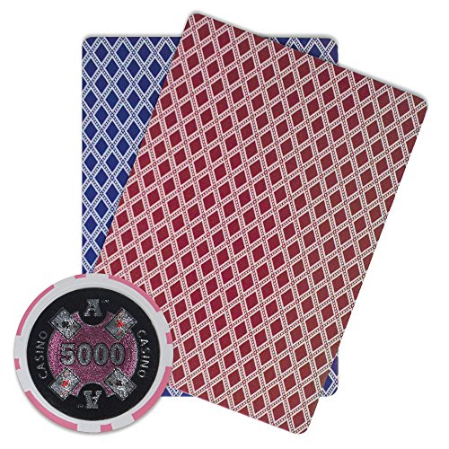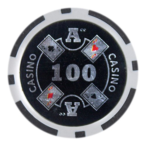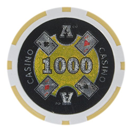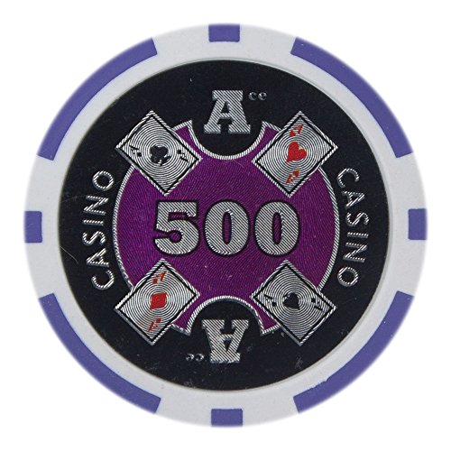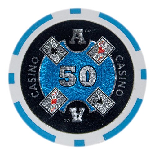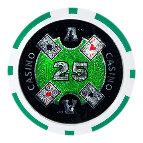 These heavyweight clay composite poker chips are great for cash and tournament games alike, for casual players and high rollers. Available in 11 denominations ranging from $1 to $25,000, the inlay art features dazzling laser art of four aces and large, easy-to-read denominations, and the clay's grippy texture makes stacking these chips a breeze.