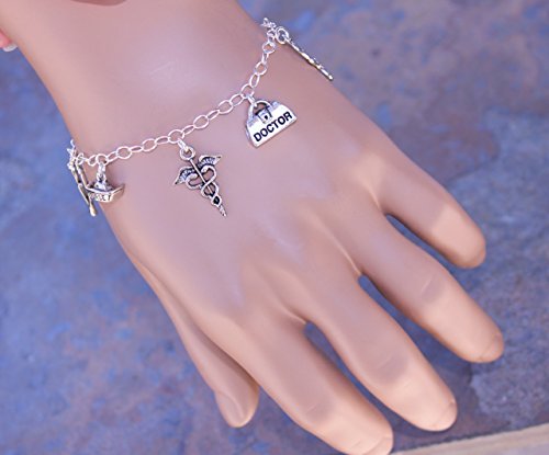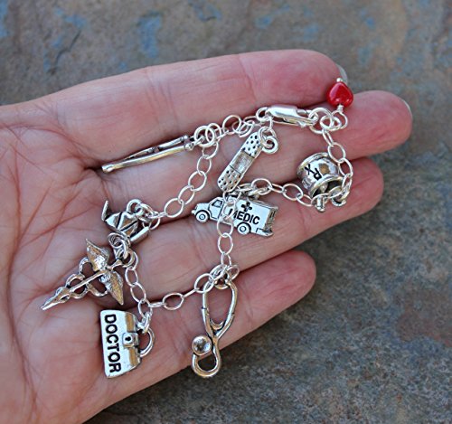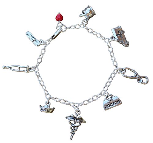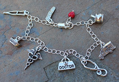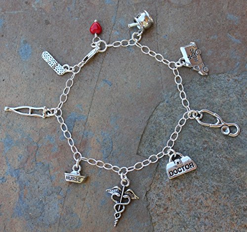 -. Feature : 8 slightly antiqued pewter charms with a medical theme, including: ambulance, band-aide, doctor's bag, stethoscope, nurses' hat, crutch, Rx mortar and pestle, and the medical symbol, plus a red glass heart. / Delicate sterling silver cable bracelet chain with sterling silver lobster clasp. / Available in size XS (6.5 inches), S (7 inches), M (7.5 inches), L (8 inches), XL (8.5 inches). Please pick your size from the size choice boxes below item title! / Handmade in the USA by Night Owl Jewelry. / The pewter charms are made in the USA and contain no lead or nickel. They range in size from 1/4 inch to 1 inch long (6.5mm - 25mm).