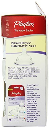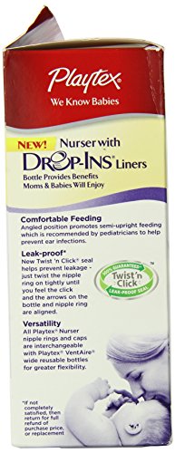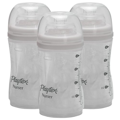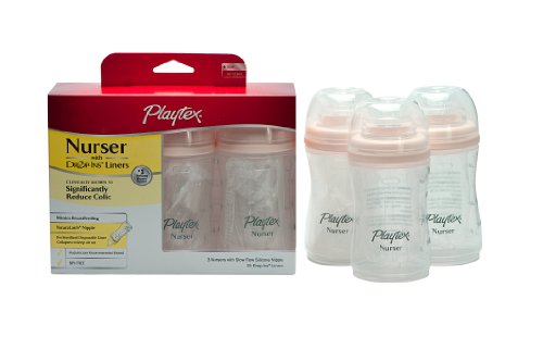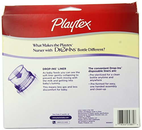 -. Binding : Baby Product -. Brand : Playtex -. Feature : This unique system has been clinically shown to help reduce gas, colic, and spitting up / The Playtex Drop-Ins Premium Nurser Bottle features holders and pre-sterilized, disposable liners that collapse to keep air out of the bottle and your baby's system. After each feeding, the liner is discarded, so there is one less thing to clean. / Reduces gas and colic / BPA free -. Label : Playtex -. Manufacturer : Playtex -. Model : Playtex Premium Designer Nurser PARENT -. ProductGroup : Baby Product -. ProductTypeName : BABY_PRODUCT -. Publisher : Playtex -. Size : 8 - 10 oz -. Studio : Playtex -. Title : Playtex 3 Pack Baby Drop Ins Nurser