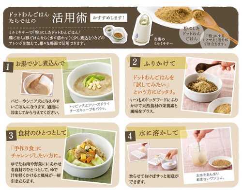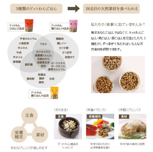 原材料:玄米(山形産・他)、鶏胸肉(三重・和歌山産・他)、ポークエキス(国産)、ポークオイル(国産)、鶏肝臓(山形・宮城産)、豆腐おから(埼玉・神泉村産)、カツオ節(国産)、さつま芋(国産)、助惣タラ(国産)、豚骨カルシウム(国産)、にんじん(千葉産・他)、カツオエキス(静岡・焼津産)、昆布・ワカメ(北海道産・他)、ビタミン・ミネラル類(栄養添加物は総量の1.5%以内)※ 塩化カリウム、ピロリン酸第二鉄、グルコン酸銅、炭酸マンガン、グルコン酸亜鉛、ビタミン(D・E)、パントテン酸カルシウム、葉酸、ビタミンB12