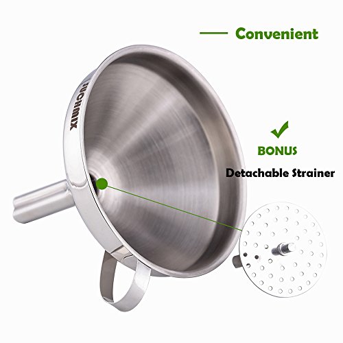 - ULTIMATE CAPACITY - A detachable strainer is also included in order to filter solid from liquids just like that. Just place the strainer in the stainless steel funnel during the filtering process and get ready to be amazed. A small yet might tool for filtering larger solids as well now there's nothing you can't filter