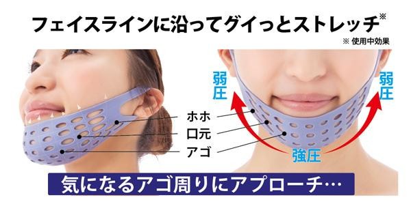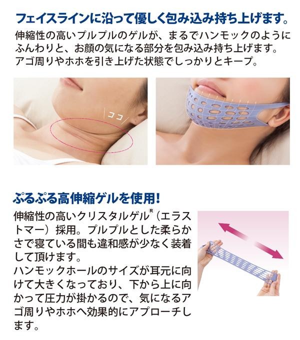 寝ている間に顔のたるみをケアする「アガールスリーピングハンモック」。人肌に近いゲル素材を使っているのでリフトアップしながらも着け心地は快適。