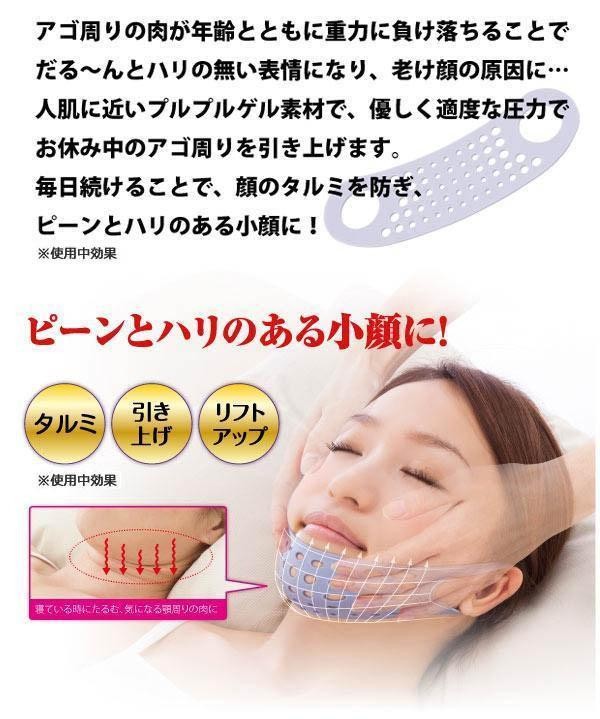 fk094igrjs寝ている間に顔のたるみをケアする「アガールスリーピングハンモック」人肌に近いゲル素材を使っているのでリフトアップしながらも着け心地は快適 商品区分 雑貨 サイズ 約195×60×2mm 個装サイズ:10×13×1cm 重量 約15g 個装重量:25g 素材・材質 熱可塑性エラストマー 製造国 日本 たるんだフェイスラインをグイッと持ち上げる 寝ている間に顔のたるみをケアする「アガールスリーピングハンモック」人肌に近いゲル素材を使っているのでリフトアップしながらも着け心地は快適
