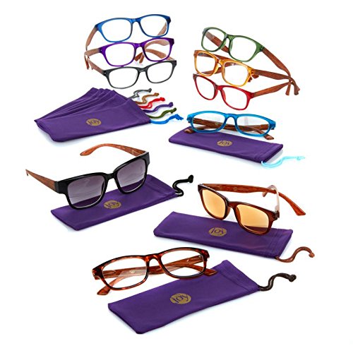 -. Feature : 7 Pairs of readers / Pair of computer readers / Pair of executive-style bifocal sunglasses / Pair of transitional readers / 10 Slip cases