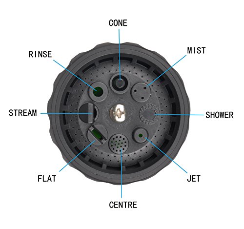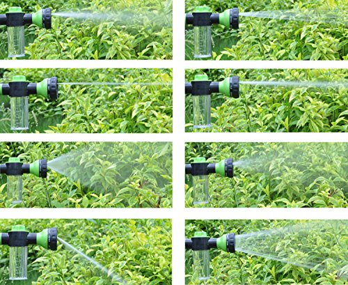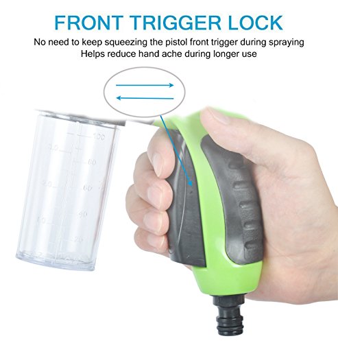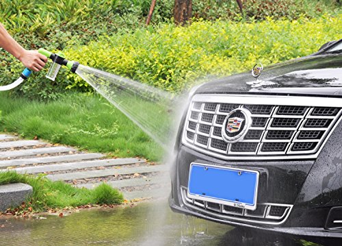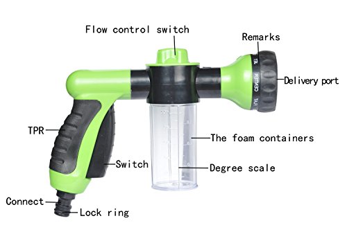 -. Feature : ✓ 8 WATERING PATTERNS: Garden hose nozzle can choose different types of spay patterns from CONE , MIST, FLAT, RINSE,SHOWER,SOAKER, CENTER and JET to meet all of your watering or washing needs . The adjustable washer gun provide clearly marked and easily triggered settings in the nozzle to help you choose your needs / ✓ WATER & FOAM FLOW CONTROL : The garden hose nozzle with a bubble loaded position to storage foam ,you can revolving the top round knob to control the water pressure choice for three kinds of switching mode / ✓ FRONT TRIGGER LOCK : No need to hold the handle keep squeezing all the time under the garden hose noozle using process, more comfortable and convenient / ✓ BEST RESOURCE PROTECTION: The garden hose nozzle can help you to control the shape and flow of water coming to adapt to different needs that will enable the utilization of water resources to reach the maximum / ✓ MULTIPURPOSE : The washing squirt gun can be widely used on washing cars, motorcycles, electric vehicles, truck , watering flowers & trees , irrigation, flushing floor & road, washing wall ,showering pets (like horse & pig & dog & cat) playing and etc