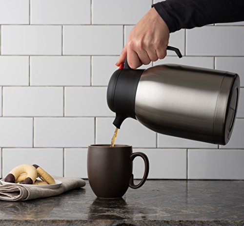 • HANDLE-BUTTON TECHNOLOGY | THE EASIEST CARAFE TO USE: From filling to pouring, this insulated carafe is engineered for simplicity. Wide-mouth architecture allows even the most distracted users to pour hot or cold liquids without spilling a drop. Same-hand pouring design leaves your other hand free.