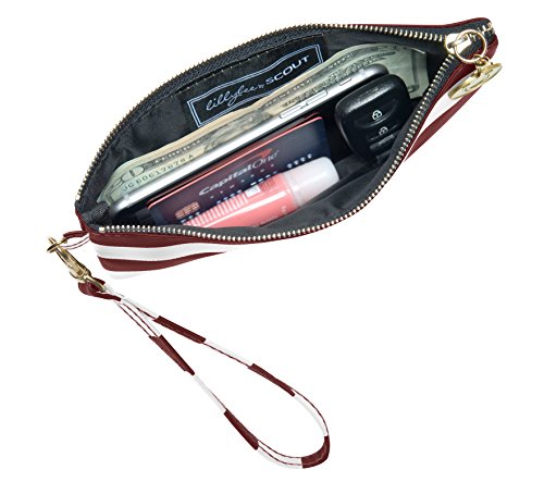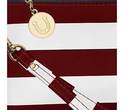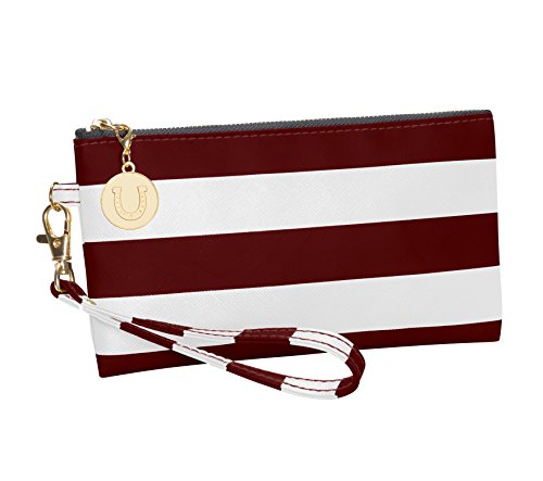 Product Description With this colorful and versatile maroon and white striped wristlet, you can use as a clutch or remove the wrist strap and use as a makeup bag inside your favorite tote. Cute and clever, these maroon and white stripes make the statement, while the charm provides the punctuation. 0