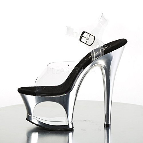 Product DescriptionMOON-708/C/SCH features 7" (178mm) Heel, 2 3/4" (70mm) Cut-Out Platform Ankle Strap Sandal w/ Chrome Plated Platform Bottom0