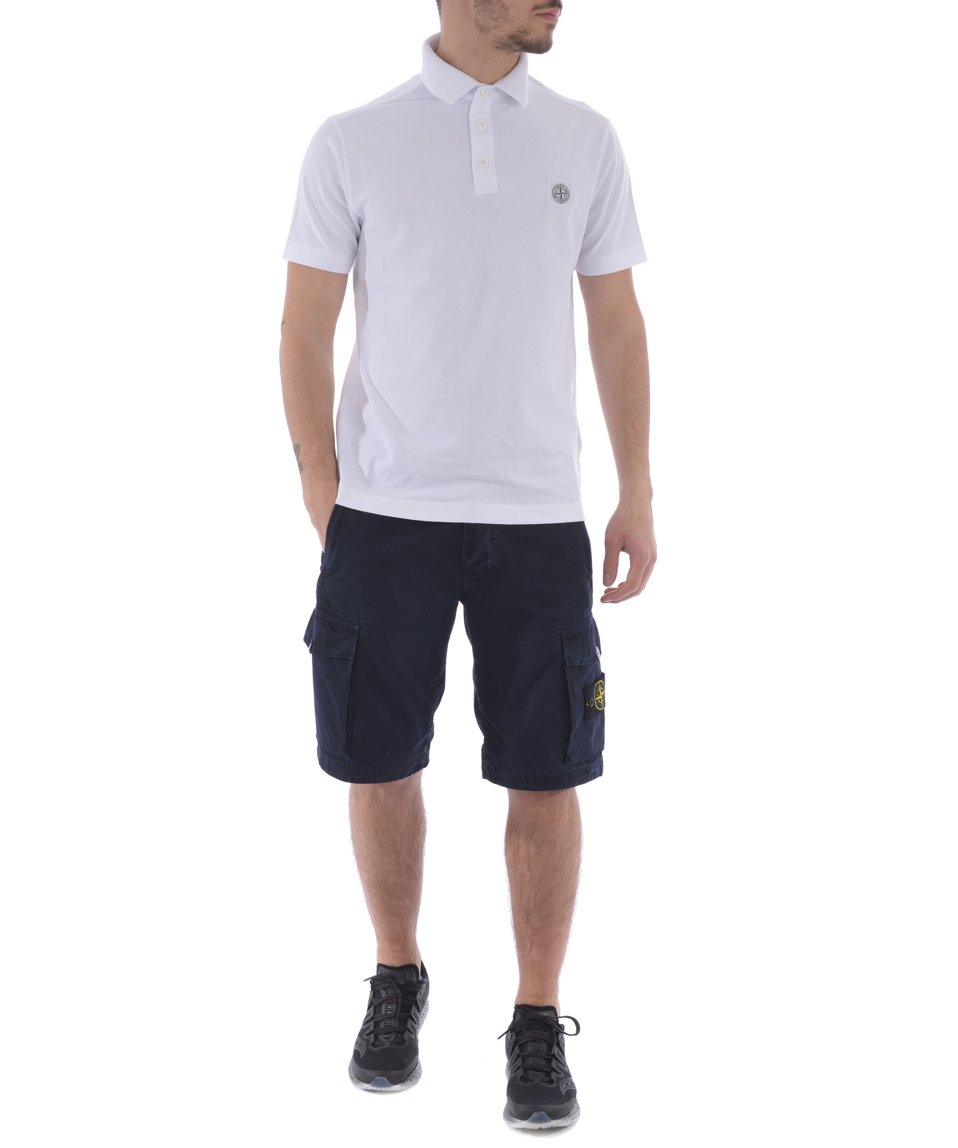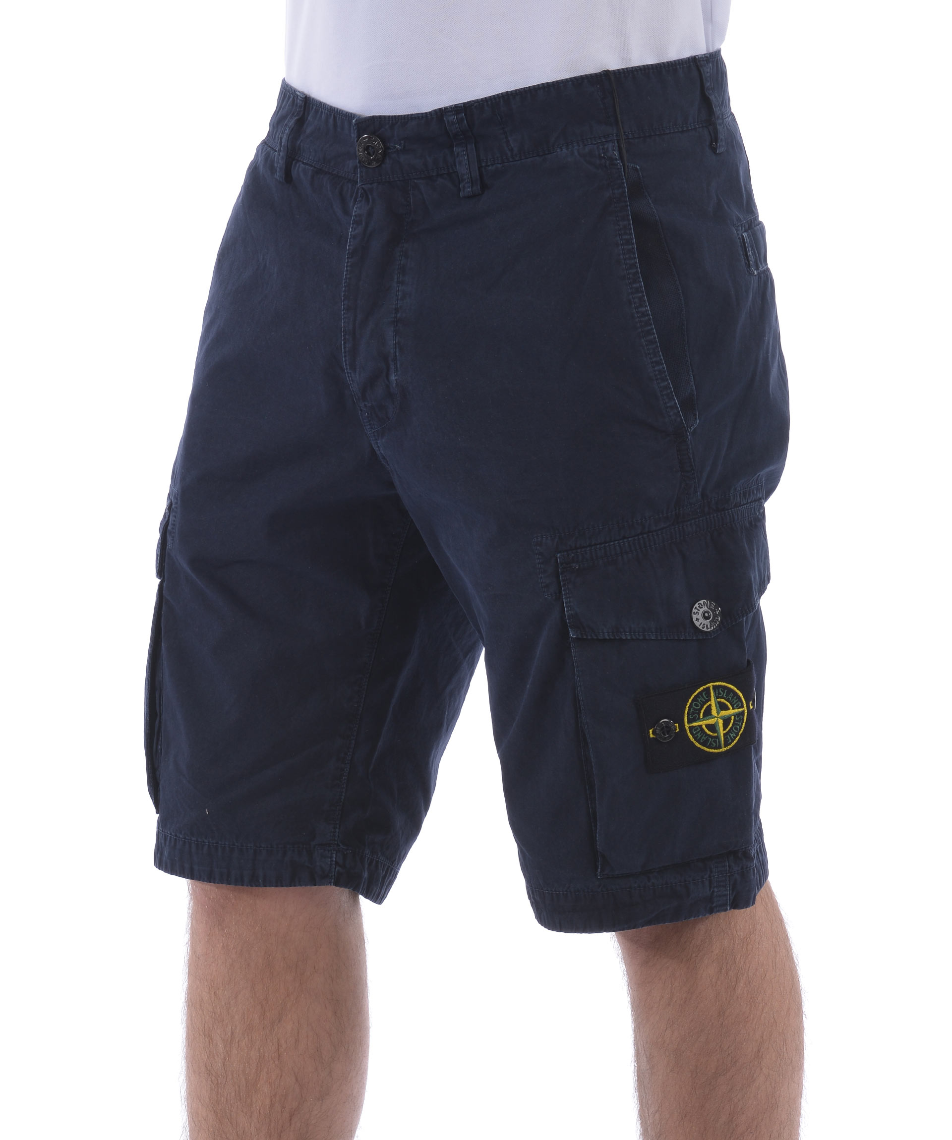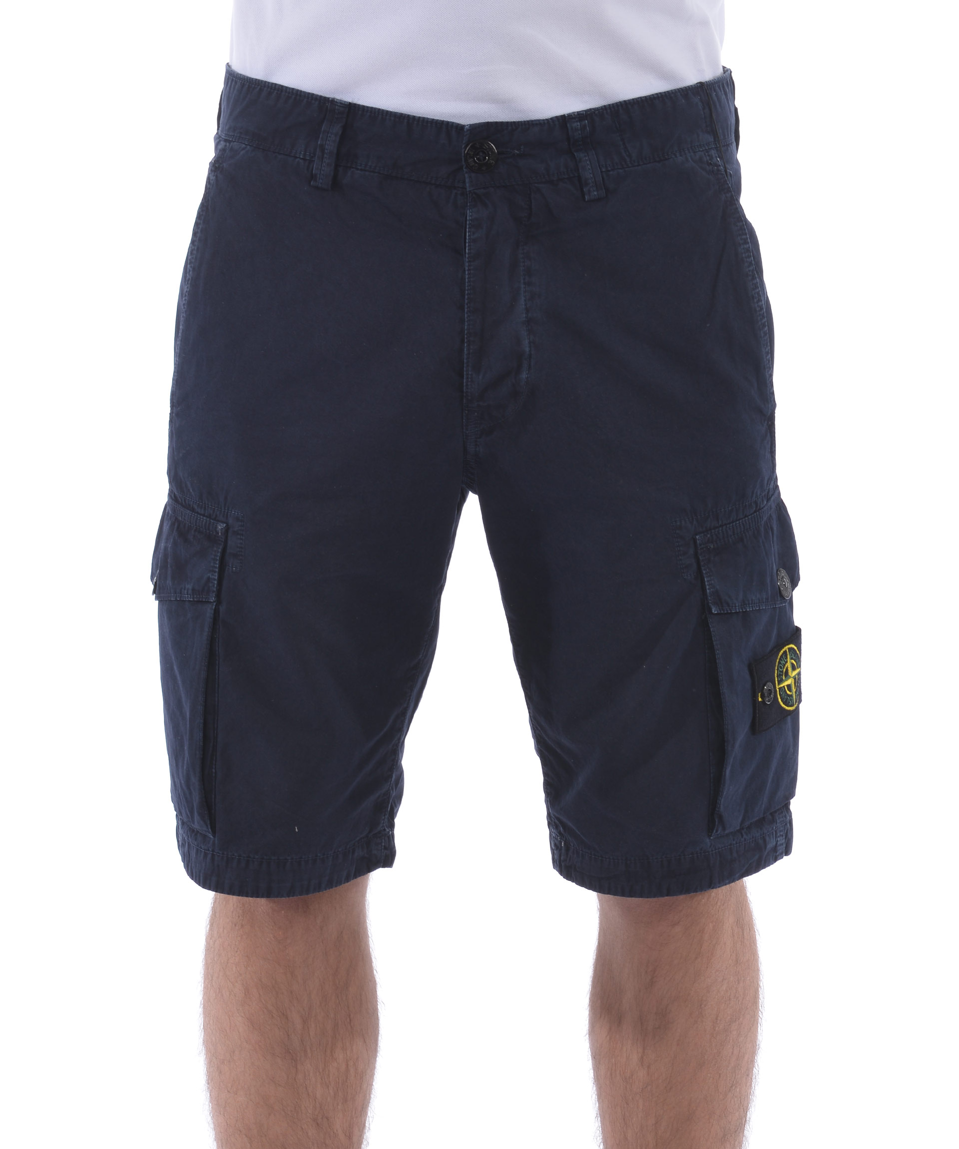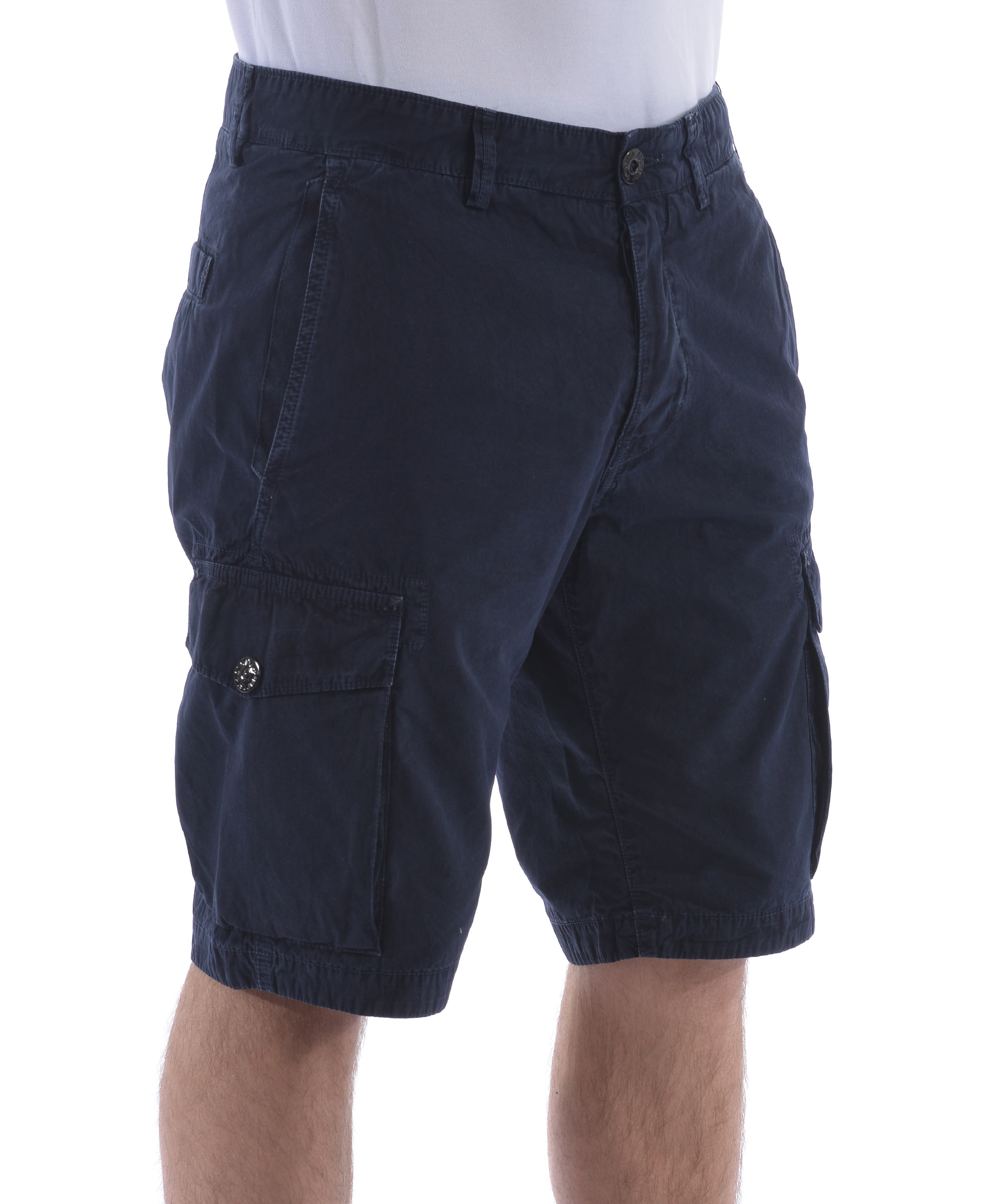 Shorts Stone Island in gabardina di cotone Blu scuro effetto old. Tasche diagonali. Tasconi cargo con pattina e bottone. Tasche posteriori a filo con bottone a pressione. Chiusura con bottoni. Patch logo removibile sul tascone sinistro.