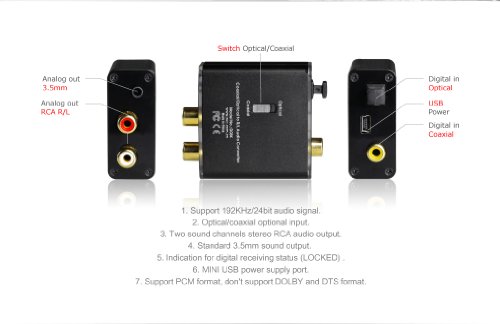 Converts a digital coaxial/optical S/PDIF signal to two-channel (left/right) analog output, which can then be fed to an amplifier or to WLAN headphones
