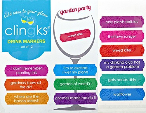 -. Feature : Clingks® are an edgy and fun alternative to wine charms. A great conversation starter to encourage mingling! / Add sass to your glass! Modern and Fun way to find your drink at a party. Find your drink by Color, Pattern, or Sassy saying / Leaves no residue - safe for all styles of drinkware. Made of Vinyl Static Cling. Cling to any non-porous surface: glass, aluminum, ceramic & plastic. / Reusable Designs - reuse from glass to glass and from one party to the next. Dimensions: 1/5 x 2-Inch - 12 Markers in a set. / NOT Dishwasher Safe, NOT Microwave Safe. Made in USA