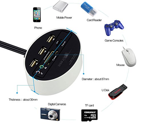 E-More Multifunctional 9 in 1 Hub With USB Extender/Splitter Headset/Microphone Jack and 4 Slot Card Reader and USB Charging Ports for iPhone iPad Samsung Motorola HTC and Other (White) B013BF6C8Y