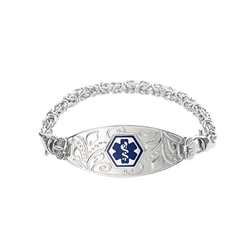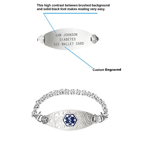 -. Binding : Jewelry -. Brand : Divoti -. Department : womens -. Feature : Easily provide your custom engraved content by selecting the CUSTOMIZE NOW button to the right. / Custom engraved in high contrast black laser engraving to personalize your medical message (on back : 4 lines of 18 characters, spaces included) / Hypoallergenic 316L medical alert bracelet and comes with size options 6.0-8.5 inches. / Deep embossed caduceus symbol with hard enamel filled on the front of medical alert bracelet. Excellent wear resistance. / Includes free customizable medical alert wallet card, medical alert smartphone apps and Velvet gift bag. -. Label : Divoti Inc. -. Manufacturer : Divoti Inc. -. Model : 5111DBU -. MPN : 5111DBU -. PartNumber : 5111DBU -. ProductGroup : Jewelry -. ProductTypeName : FASHIONNECKLACEBRACELETANKLET -. Publisher : Divoti Inc. -. Studio : Divoti Inc. -. Title : Divoti Custom Engraved Lovely Filigree Medical Alert Bracelet -Handmade Byzantine-Deep Blue