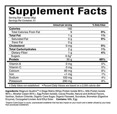 Magnum QuattroTM is a 4 isolate, time-released, smooth digesting protein. With no lactose and a combination of 4 high-quality isolates, essential fats like CLA and flaxseed, Magnum QuattroTM is the great-tasting protein you have been waiting for!