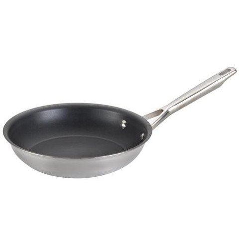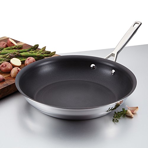 Enjoy the benefits of professional-quality skillet cooking with the Anolon Tri-Ply Clad Stainless Steel 12-3/4-Inch Nonstick French Skillet. The generous diameter of this versatile pan makes it easy to turn pork chops or toss sauteing vegetables. And, with a long-lasting nonstick coating, easily slide foods out of the pan and onto the plate. Create an heirloom vegetable omelet, a family-sized helping of chicken and yakisoba noodles or sear teriyaki rib eye steaks. The cookware's durable three-ply construction features an aluminum core between layers of stainless steel for excellent, efficient heat distribution all the way up the sides of the pan. This cookware is suitable for use on all stovetops, including induction, and the polished, sophisticated stainless steel exterior is easy to clean. The comfortable, stylish handle is dual riveted for strength and provides a confident grasp. For convenience, this skillet and the other pieces from the Anolon Tri-Ply Clad Stainless Steel collection are dishwasher safe for easy cleanup and oven safe to 500 Degree F. Showcase the best ingredients in every skillet sensation created in the versatile and sophisticated Anolon Tri-Ply Clad Stainless Steel 12-3/4-Inch Nonstick French Skillet.Feature