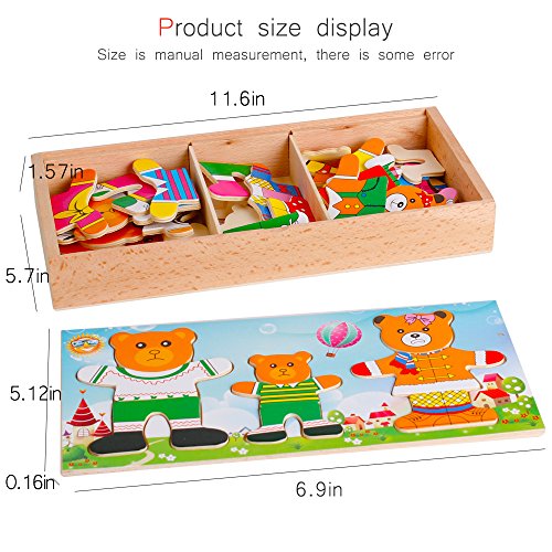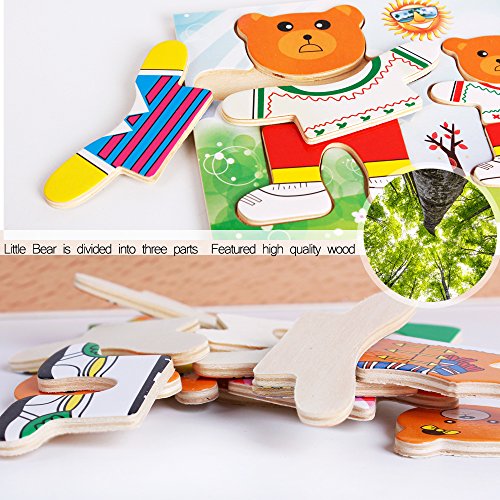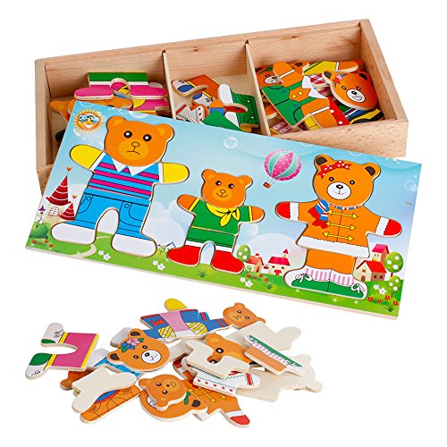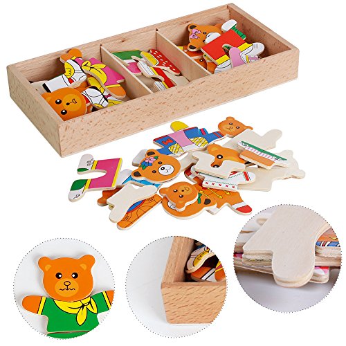 Packing list: 1 set of 3 bears dress-up Jigsaw puzzles ─Bear family dress-up toy is a wonderful toy for kids to have fun while developing physical, cognitive, and fine motor skills. ─Each bear have 6 different style outfits. Kids can change the bears' outfits and shoes according to there own idea. ─Great toy for developing coordination, imagination and creativity. CHOKING HAZARD -- Small parts. Please playing under adults' supervision. 0
