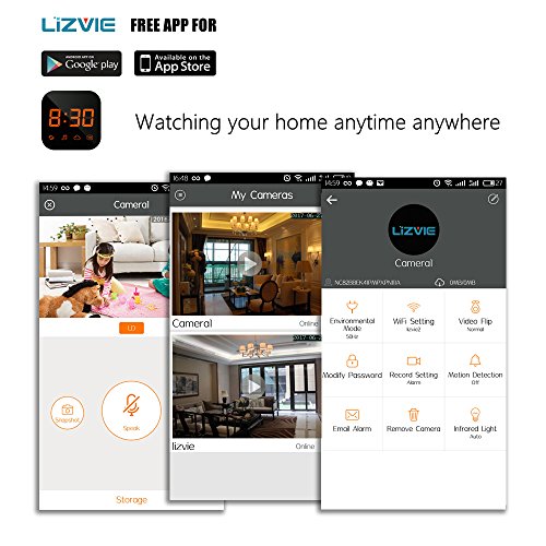 - LIVE VIDEO AND SD CARD RECORDING: With Lizvie APP,you can know everything at home by watching you cell phone/pad and computer anywhere anytime while the camera connect to WiFi. The app allows you to receive alerts on cellphone and take a video when the motion detection kicks in and detects movement. The motion sensitivity is adjustable to allow for minor or large movement. In addition, the clock can be set to record to the SD card, you can watching what happened in your house on the laptop.