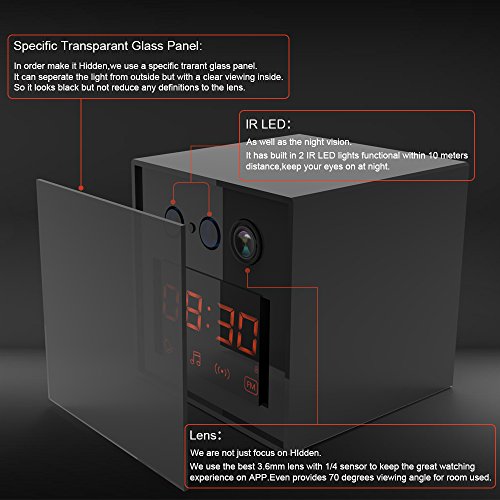 - VARIETY OF USEFUL FUNCTIONS:Hidden Clock Camera with 12 and 24 Hour Formats, not just a clock, it's a alarm clock, Bluetooth wireless speaker, WiFi camera, video recorder, FM radio.