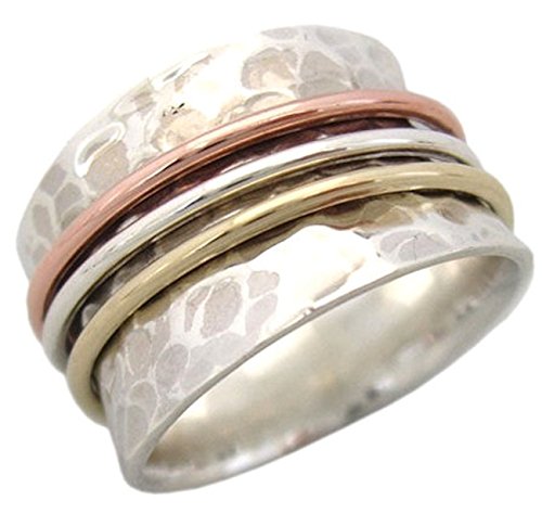 -. Binding : Jewelry -. Brand : Energy Stone -. Department : womens -. Feature : SERENITY / Meditation spinning ring handcrafted by Indian artisan for Energy Stone / Beautiful hammered pattern sterling silver base shank with 3 outer spinners in silver, brass and pink copper / Elegant and rich looking -- 12 gram of silver / Ring tappers in the back for comfortable wear -. Label : Energy Stone -. Manufacturer : Energy Stone -. Model : US12 -. MPN : US12 -. PartNumber : US12 -. ProductGroup : Jewelry -. ProductTypeName : FASHIONRING -. Publisher : Energy Stone -. Studio : Energy Stone -. Title : Energy Stone "SERENITY" Tapered Band Tri-Color Spinners Sterling Silver Meditation Ring (Style# US12)