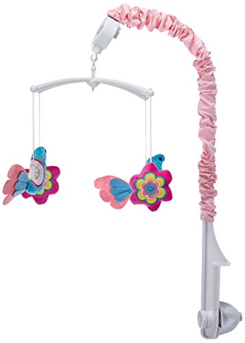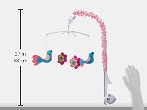 - features 4 plush shapes of flower and birds, fabric-covered stand with musical movement.