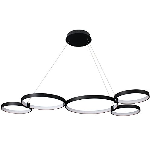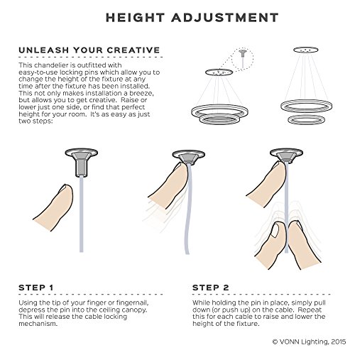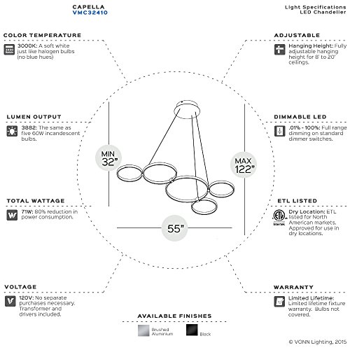 Product inspiration: gaze into the night sky and you'll find your eyes resting on Capella, the brightest star in the constellation Auriga. The Capella collection by VONN is inspired by this unique and rare celestial body Sharing the same spectral colors of our sun. The multi-ring design and the LED DIODE array placement (on the interior of the rings) creates a sense of purpose and harmony as the eyes travel the contours of the fixture. Product features: • LED: on-board LED system is integrated into the fixture • unique design: five-ring modern LED chandelier with indirect, interior glow, and outward finished-aluminum face • adjustable: cable locking pins allow the suspension height to be easily changed post-install • dimmable: full dimming, 0.01% to 100%, on silicon-based dimmer switches such as Lutron skylark • soft white: 3000 Kelvin color temperature, the same as halogen bulbs • high-output: 3882 lumens, roughly the same as five 60 watt incandescent bulbs • efficiency: 71 watts TOTAL consumption, 0.071Kwh • dry location: ETL listed and approved for dry locations (kitchen is okay) • voltage: Operates on standard 120 line voltage; a separate transformer is not required product Technologies and benefits: • PEARLPURE DIODE ARRAYS: brilliant, full-bodied white light with high color rendering • CONTINUU DRIVER: responds to the needs of the diodes as they age • voptics diffusers: engineered prismatic lenses diffuse light evenly across a wide angle • limited lifetime warranty: fixture and LED system are covered for as long as you own your home. Product specifications: • bulb type: LED • length: 55.12 inches • depth: 27.95 inches • overall height: Min: 31.49 inches, Max: 121.85 inches • CANOPY dimensions: 11.02 inches x 11 inches.Feature