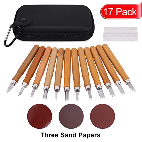 Wood Carving Kit ,17 PCS Wood Carving Knife Tool Set for Beginners with Whetstones-Sand Paper and Storage Bag Professional Wood Carving Chisel Set