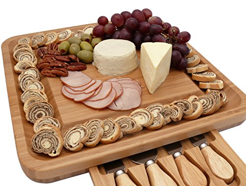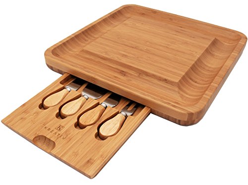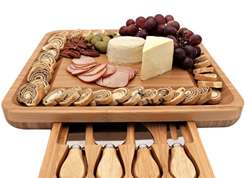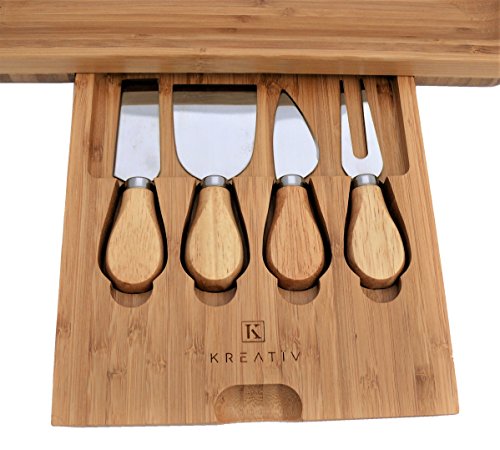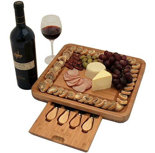 Premium Bamboo Cheese Board Set with Hidden Slide Out Drawer - Cutlery Set Included (Drawer does not interrupt the use of the Cheese Board)