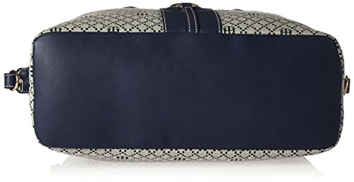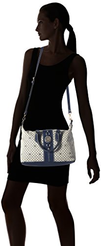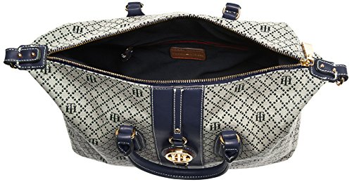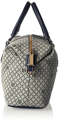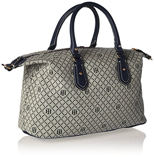 Top handle satchel handbag for women featuring the Tommy Hilfiger women signature flag stripe and gold th hardware. Double top handles and removable convertible strap with gold hardware details. Flat bottom, top zip closure. Lined nylon interior with wall zip pocket and slip pocket. This Tommy Hilfiger bag is a versatile essential, perfect for your next work bag. Our timeless Tommy Hilfiger handbag is a stylish addition to your collection of top handle handbags. 13-3/4 length; 8-1/2 height; 5-1/2 width.Feature