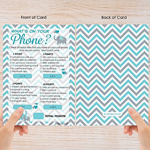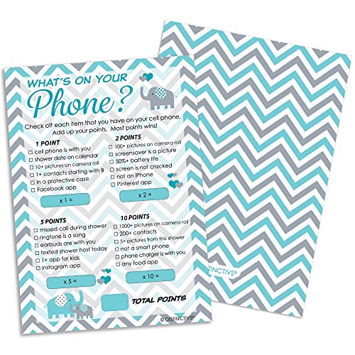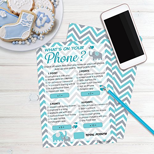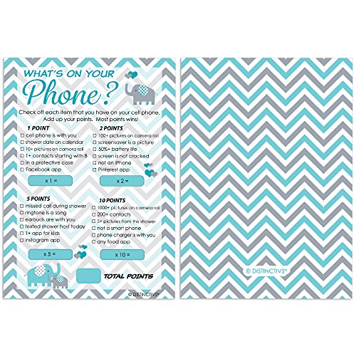 What's On Your Phone - Teal Blue Elephant Boy Baby Shower Game Cards (20 Count)