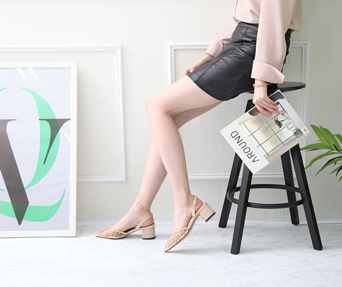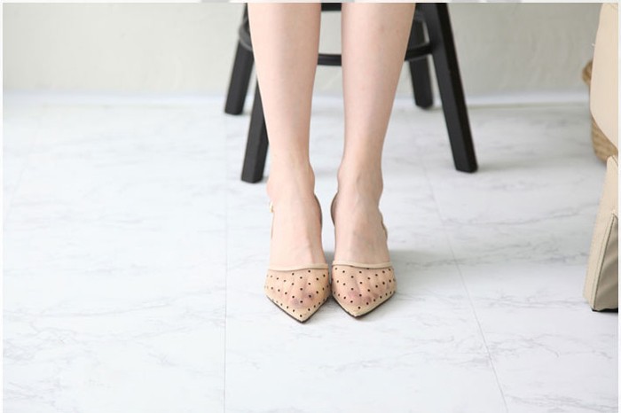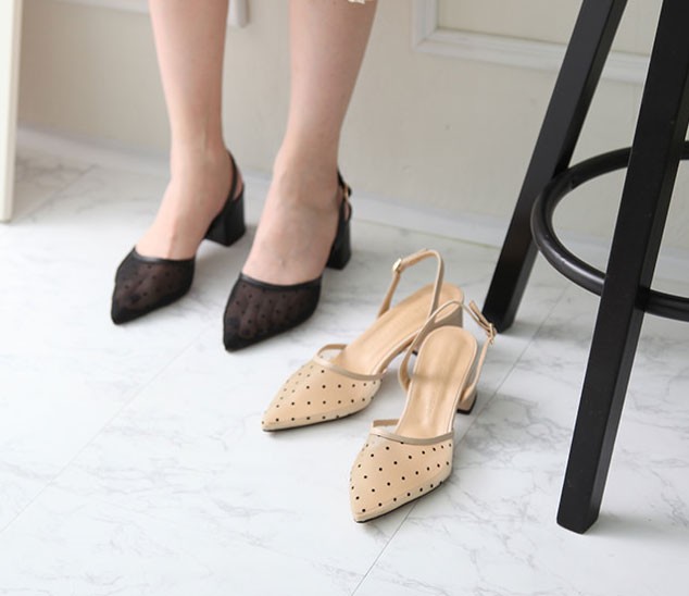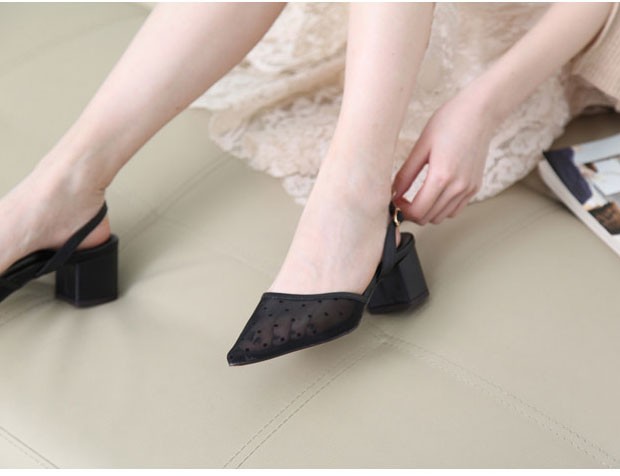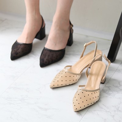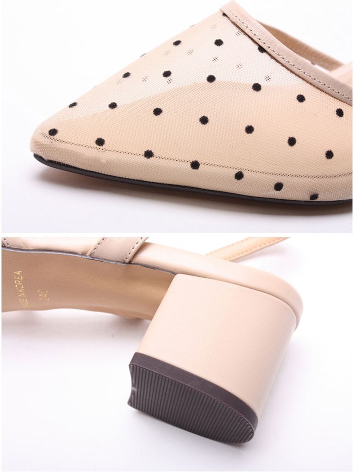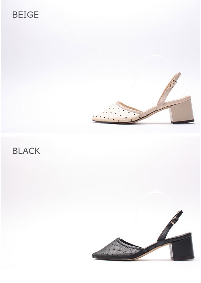 商品名:サンダル レディース 太ヒール スリングバック ポインテッドトゥ チュール ドット 2018 春 ファッション 靴 婦人靴