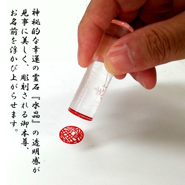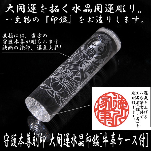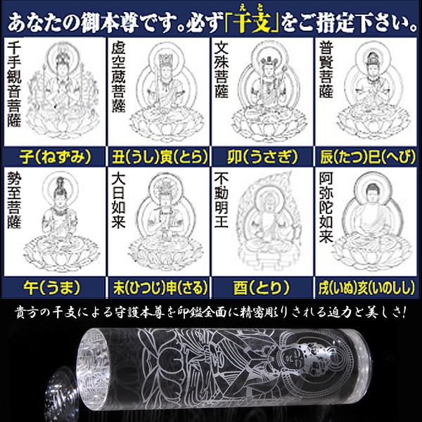 守護本尊刻印+名前を水晶彫り。一生物の『印鑑』をお造りします。支柱には、貴方の守護本尊が彫られます。決断の捺印、運気上昇を祈願!神秘的な幸運の霊石『水晶』の透明感が見事に美しく、彫刻される御本尊、 お名前を浮かび上がらせます。実印として使われる事の他、魔除けの象徴として、人生の”御守り品”として造られる程、重宝される印材です。●貴方の干支による『守護本尊』を印鑑全面に精密彫りされる迫力と美しさ!●運気を上げるとされる八方篆書体でお名前(姓・名)を彫刻致します。●あなたの御本尊です。必ず、『干支(えと)』をご指定下さい。【子(ねずみ)】千手観音菩薩、【丑(うし)寅(とら)】虚空蔵菩薩、【〓(うさぎ)】文殊菩薩、【辰(たつ)巳(へび)】普賢菩薩、【午(うま)】勢至菩薩、【未(ひつじ)申(さる)】大日如来、【酉(とり)】不動明王、【戌(いぬ)亥(いのしし)】〓阿弥陀如来【今なら豪華プレゼント!】■今回ご注文されますと、『豪華桐箱』『牛革印鑑ケース(朱肉付)』が付属されます!■サイズ:約(直径)15x(長)60mm