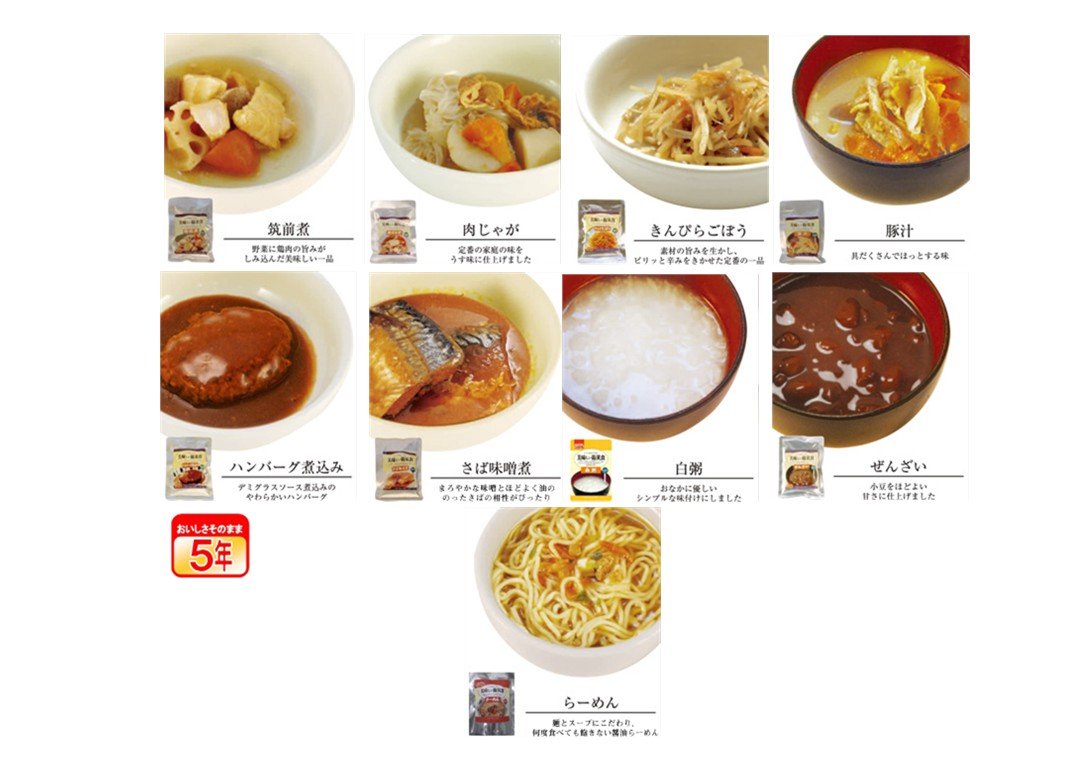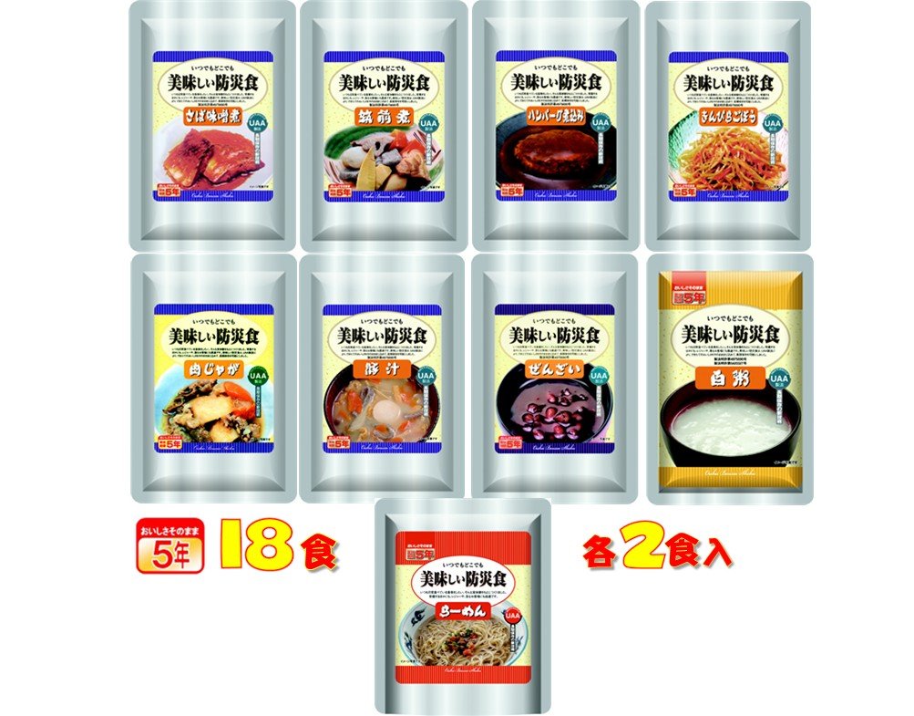 Delicious Disaster Prevention Food Set with 18 Meal 5 Years Preserved Diet <Contents Amount> 18 Pack <Sterilization Method> Seal in an airtight container and pressurized heat sterilization <Preservation method> Avoid direct sunlight and preserve in cool dark place <Shelf Life> Manufacturing