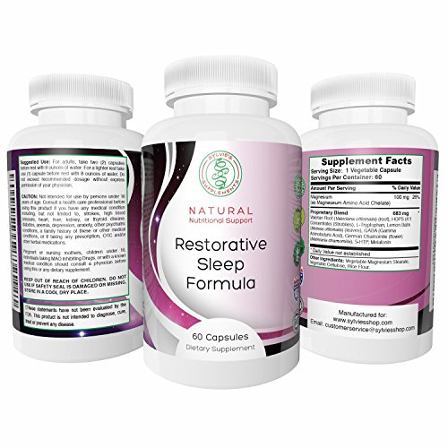 Studio : Sylvie's Shop Publisher : Sylvie's Shop Binding : Health and Beauty Product Description No more counting sheep! Sleep like a baby! Use Restorative Sleep Formula with its multiple herbal formula for the Best Night's Sleep Ever. VALERIAN, prized for its calming attributes since time out of mind, can aid sleep generally and help relieve sleep disturbances. HOPS, LEMON BALM and CAMOMILE too have been used throughout history to help relaxation and sleeping and they work together with the Valerian and the other ingredients in this proprietary blend. MAGNESIUM naturally calms the nervous system and the muscles, helping you to relax into tranquil sleep. MELATONIN acts to regulate your natural cycle of sleeping and waking hours; ensures revitalising sleep, regulates sleep patterns where people work night shifts, can help with jet lag or seasonal affective disorder [SAD]. The result? You wake up refreshed and alert, ready for whatever the new day brings. Use in conjunction with a sensible, varied diet with plenty of fresh fruit and vegetables. Manufactured in the USA under strictest manufacturing practices. Fully Guaranteed. At Sylvie's Shop your satisfaction is ALWAYS our first priority. Click the button above and ensure you can enjoy REFRESHING, RESTORATIVE NATURAL SLEEP. CAUTION: Not intended for use by persons under 18 years of age. Consult a doctor or health care professional before using this product if you have any medical condition including, but not limited to, strokes, high blood pressure, heart, liver, kidney, or thyroid disease, diabetes, anemia, depression, anxiety, other psychiatric conditions, a family history of these or other medical conditions, or if taking any prescription, OTC and or other herbal medications. Pregnant or nursing mothers, children under 18 years of age, individuals taking MAO Inhibiting Drugs, or with a known medical condition should consult a physician before using this or any dietary supplement. Keep out of reach of children. Do not use if safety seal is damaged or missing. Store in a cool dry place. 0
