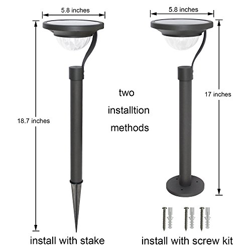 - Two install ways--1. take out the stake from the pole and insert the stake into the bottom of the pole, quickly install by pushing into the ground(measures: 5.8×5.8×18.7inches). 2. insert the round pile into the pole and fix it in the ground with screws(measures: 5.8×5.8×17inches).