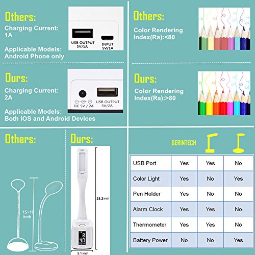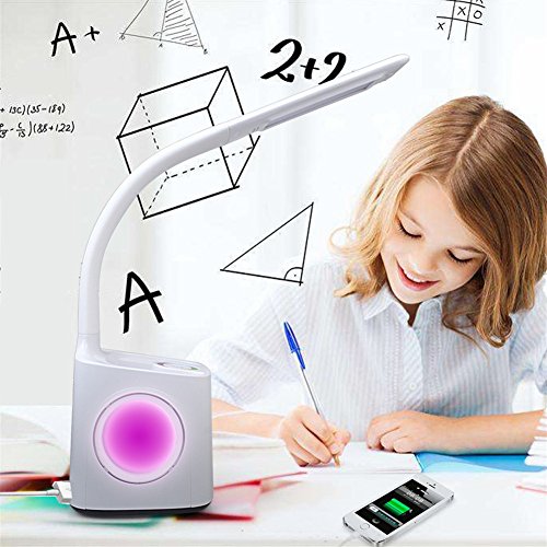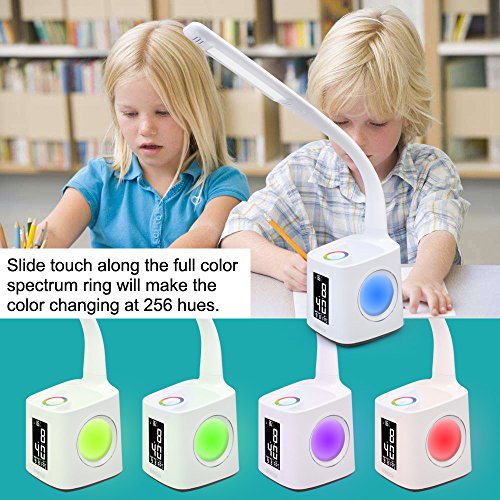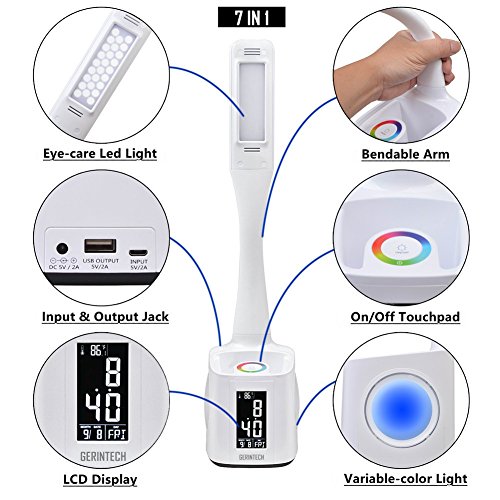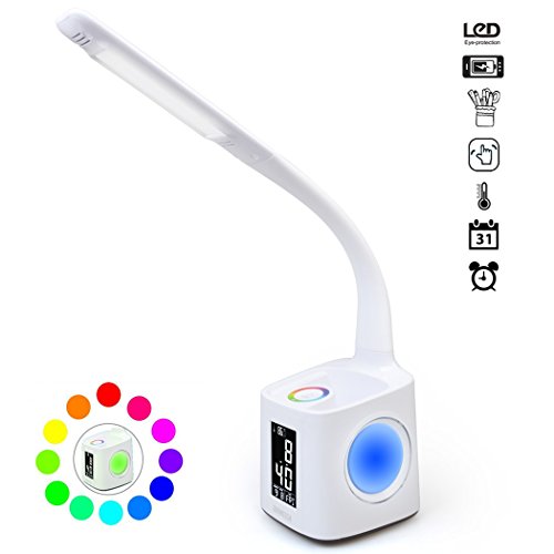 7 IN 1 ︱*Combined dimmable led desk lamp with clock, LED lighting, USB port, pencil storage, touch sensor colorful light, Fahrenheit temperature, calendar, alarm clock LCD display functions.