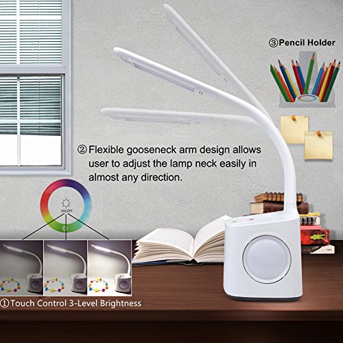 Dimmable Led Desk Lamp with USB Charging Port, Pen Holder, Touch Dimmer Switch, 3 Brightness Levels, Color Changing Base, Temperature, Calendar, Clock, 10W 2A