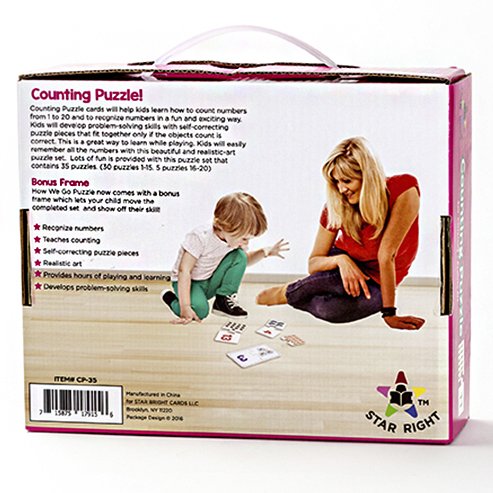 Included in the packaging: The puzzle box includes 35 puzzle sets (70 total pieces) that teach basic counting skills, with a bonus puzzle frame for travel. There are 30 puzzle sets that teach numbers 1-15, and 5 puzzle sets that teach numbers 16-20. Each puzzle is illustrated with realistic art, aiding the visual nature of the learning experience. In addition to the puzzle sets, the package also includes a bonus puzzle frame that lets your child move the completed set and show off their skill!