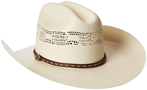 -. Feature : Two-tone braided band is detailed with Justin logo pin / Comfortable leatherette sweatband / 4 inch brim / 4.5 inch cattleman crease crown / Vented Bangora weave