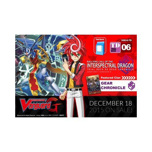 -. Feature : Chrono Shindou's VGE-G-TD06 [Rallying Call of the Interspectral Dragon] Trial Deck! New ability "Time Leap", and comes with exclusive Trial Deck only cards! / Contents: • 1 pre-constructed trial deck contains 52 pre-set cards / 19 types of cards (18 trial deck exclusives + 1 reP.R.Int with new illustration, inclusive of 4 holo cards) / Stand a chance to receive 1 hot stamp card randomly inserted into decks!! • Starter's guide, playmat and "Gear Chronicle" Clan card are included. / Release Date: December 18, 2015