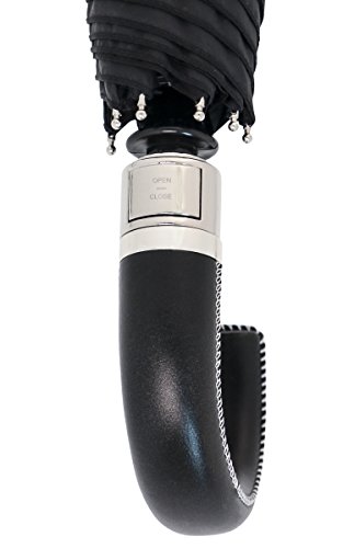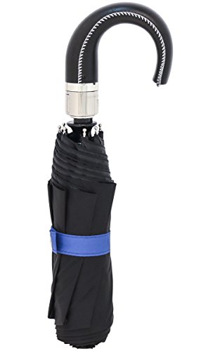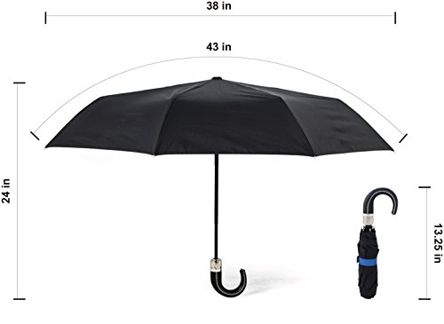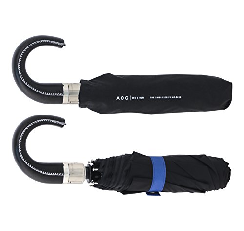 -. Feature : TIMELESS DESIGN: Traditional design meets elegant Modern flair. AOG DESIGN's curved leather handle is finished with careful white stitching. The unique blue snap-on strap not only holds the canopy neatly together but also gives it a stylish accent. / STRONG DURABLE STRUCTURE: Made with a hybrid of fiberglass and metal, our umbrellas perform great against most strong winds. Also the canopy is made with 210T Black Nylon Fabric with Teflon coating, in other words ULTRA WATERPROOF: give your umbrella one good shake and feel the satisfaction of a virtually dry canopy. / COMPACT AND COLLAPSIBLE: Compact travel size umbrella can tuck neatly in your suitcase, briefcase, backpacks, and other variety of bags. AOG's three fold compact umbrella has great coverage when open with diameter at 38-inches and dome at 43-inches. This lightweight umbrella only weighs 450g (little less than a pound). / AUTO OPEN & CLOSE: AOG's special mechanism automatically opens and closes the canopy. Open AOG umbrellas immediately when struck with a sudden downpour and close automatically if your other hand is full. Easy, convenient, and hassle-free. / TIP: Always leave open to dry. Do not let water in the underside of the umbrella when close - this will eventually cause rusting.