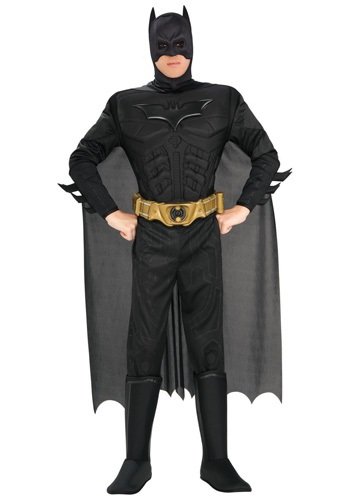 The dark knight rises in this deluxe costume includes muscle chest jumpsuit with attached boot tops, headpiece, cape, and belt, dark knight's black costume with yellow belt, available in adult sizes medium (42-inch chest, 30 to 34-inch waist), large (46-inch chest, 36 to 40-inch waist), and x-large (50-inch chest, 42 to 46-inch waist), a world leader in the creation of costumes, rubie's costume company is a family owned and run business based in new york state, with more than 60 years experience and the largest selection, rubie's has the costumes and accessories children and adults want for halloween and year-around dress up funFeature