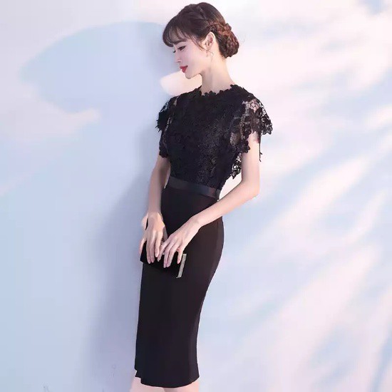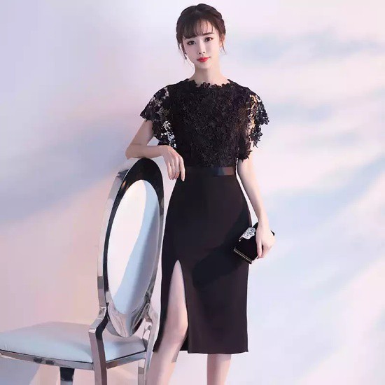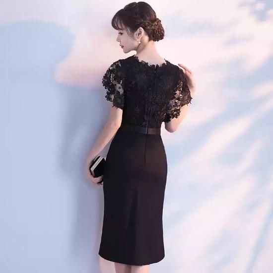 パーティードレス ひざ丈 ワンピース スリット 刺繍 レース ブラック タイト 透け感 シースルー 大人 上品 セクシー お呼ばれ デート drgz2192
