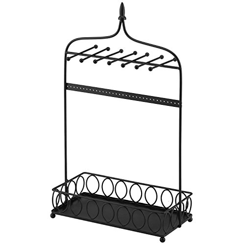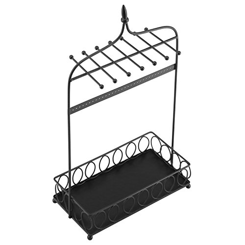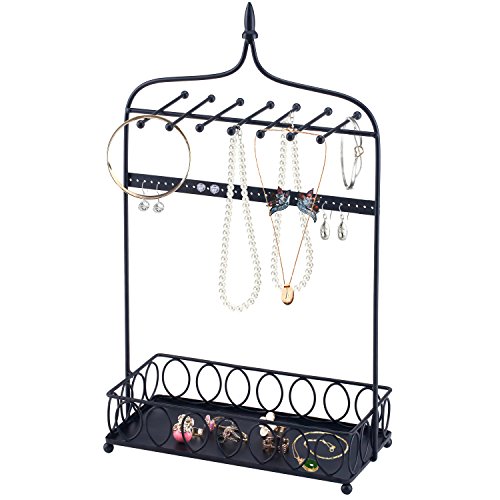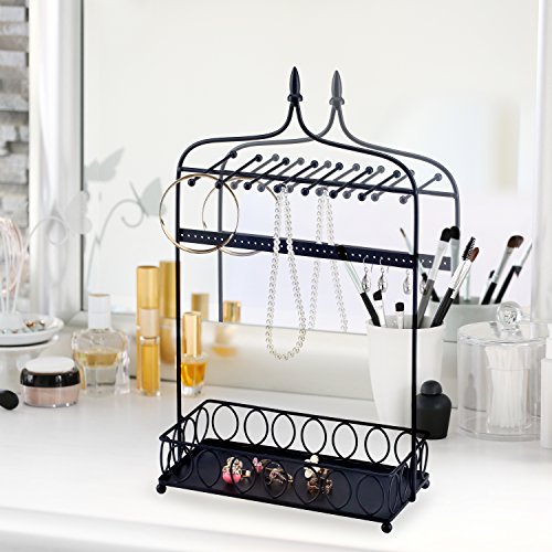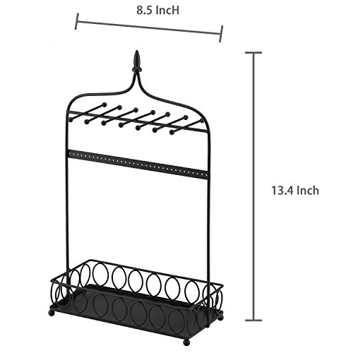 Arch Design Jewelry Organizer Metal Stand w/ 14 Necklace Hooks, 34 Earring Holes & Ring Tray, Black