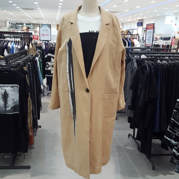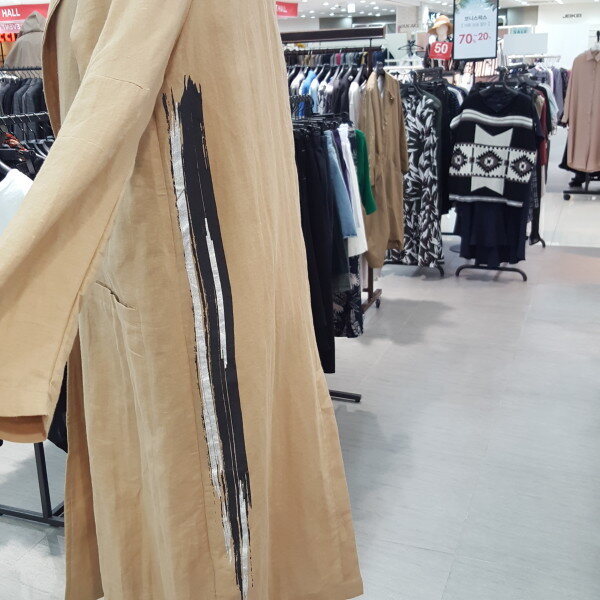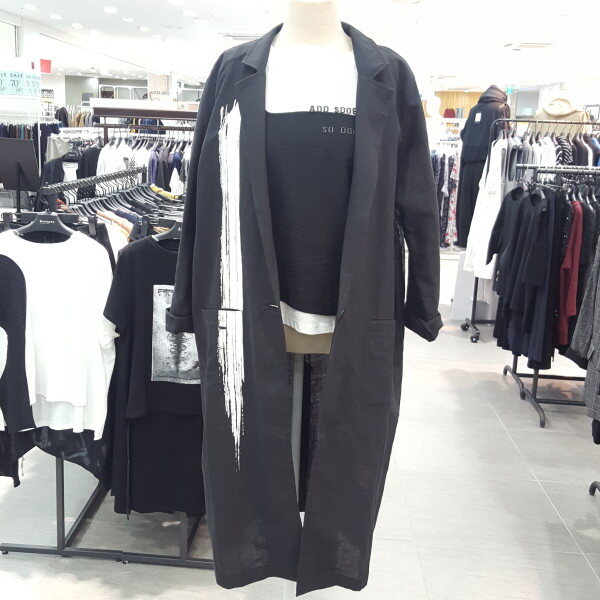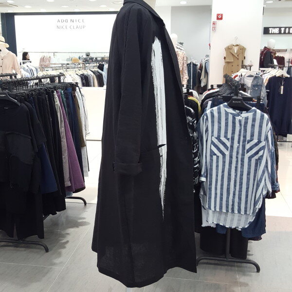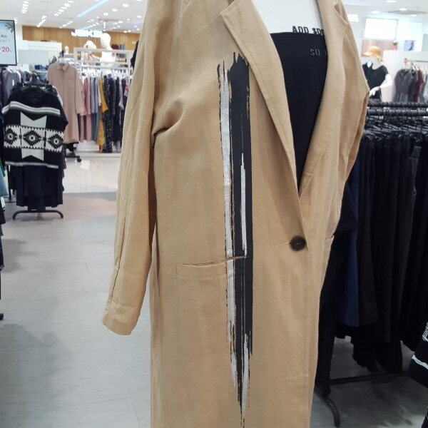 전체 루즈핏의 롱자켓에 붓터치가 포인트가 들어가 심플하고 멋스러운 디자인입니다.린넨소재로 시원하고 길이감이있어도 뒷트임이있어 활동성은 편합니다.